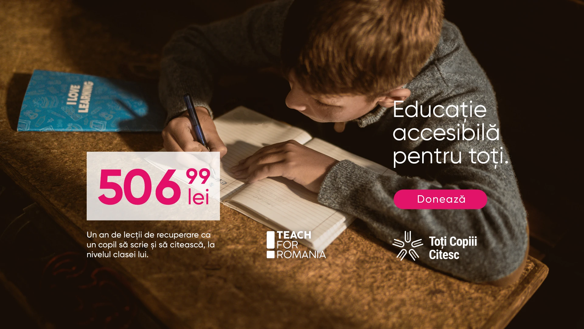 506,99 lei - doar atât costă un an de lecții de recuperare ca să ajutăm un copil de la sat să scrie și să citească la nivelul clasei lui. Răsfoiește caietul și urmărește evoluția unui copil care participă la programele susținute de Teach For Romania și Asociația Toți Copiii Citesc cu sprijinul Pepco.